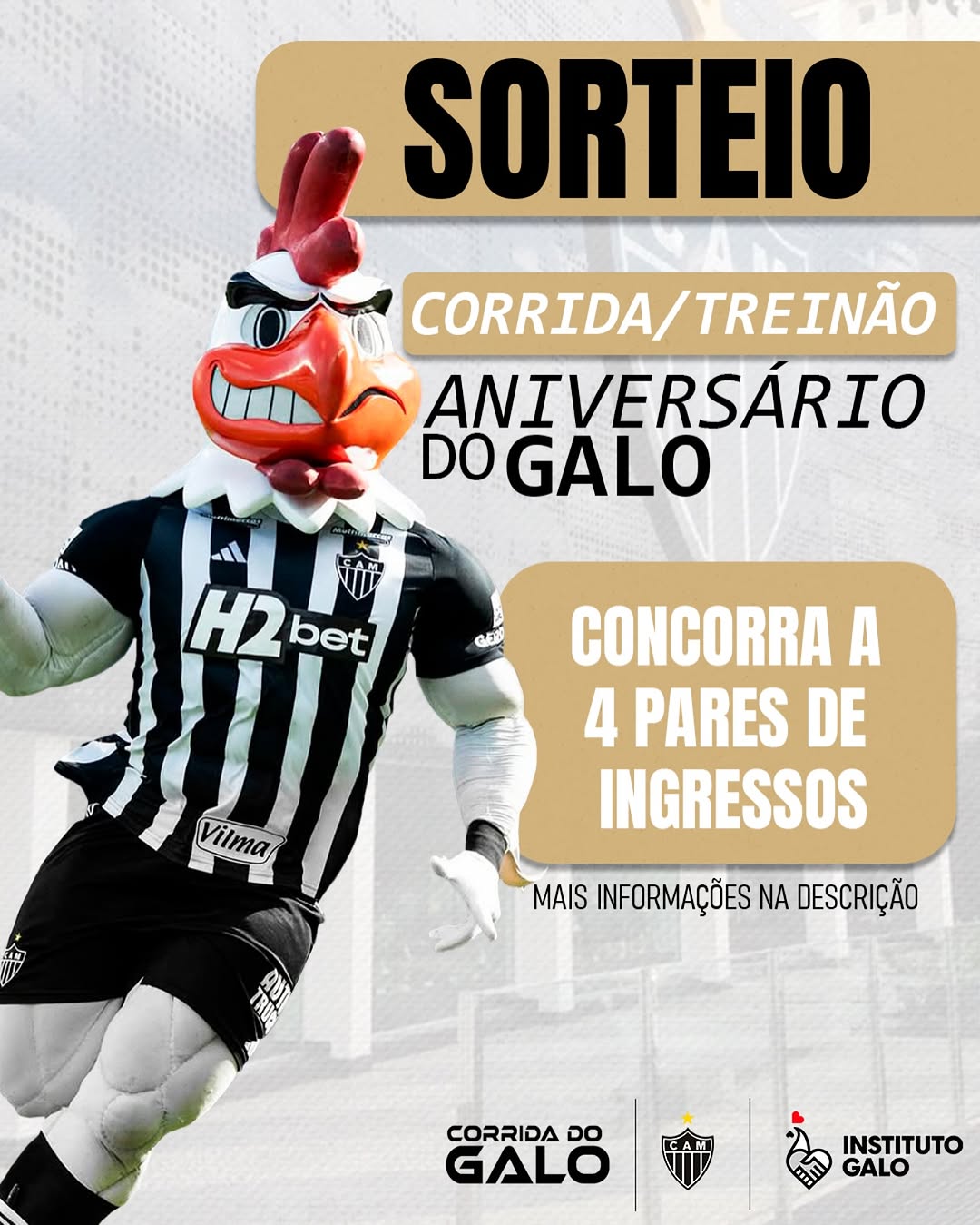 No dia 9 de março, o Instituto Galo realizou um super sorteio no Instagram para a tradicional Corrida do Galo, um dos eventos mais aguardados do ano. Foram sorteados quatro pares de ingressos entre os seguidores do perfil oficial, e a postagem alcançou quase 5 mil comentários, demonstrando a grande participação da torcida alvinegra.