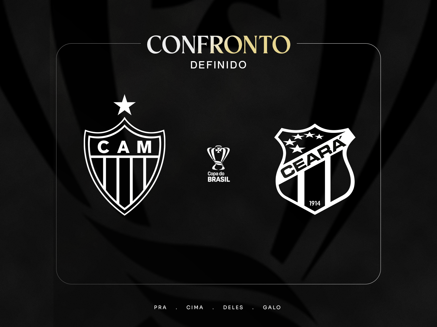 O Atlético fará o primeiro jogo na Arena MRV, diante da torcida alvinegra, com a decisão da vaga sendo disputada no Ceará. As datas-bases da quinta fase da Copa do Brasil estão previstas para os dias 22 e 23 de abril (ida) e 13 e 14 de maio (volta).