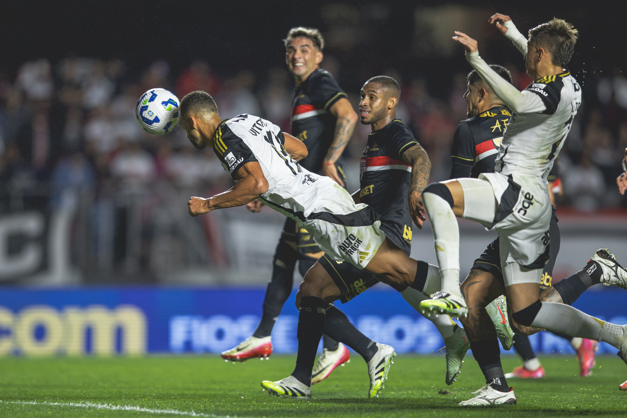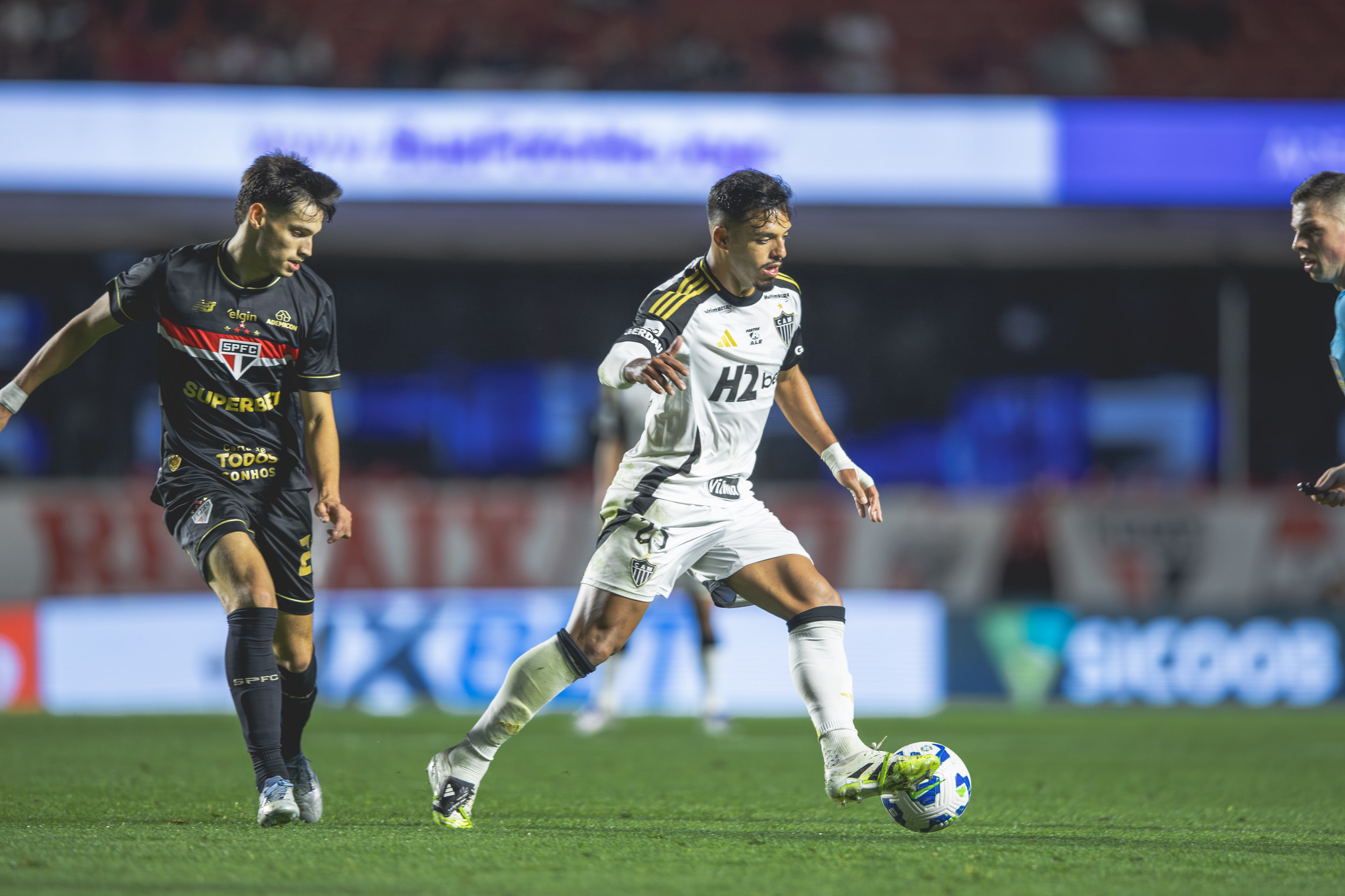 O Atlético tentava sair na velocidade para achar Júnior Santos e Rony, principalmente tendo Igor Gomes como esse elo de ligação. Entretanto, o meio de campo do São Paulo estava congestionado e cortava as tentativas alvinegras.