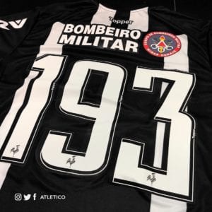 Na partida deste sábado, contra o Guarani, na Arena Independência, pelo Campeonato Mineiro, o Atlético homenageou o Corpo de Bombeiros, estampando a marca da corporação no verso das camisas, acima dos números.