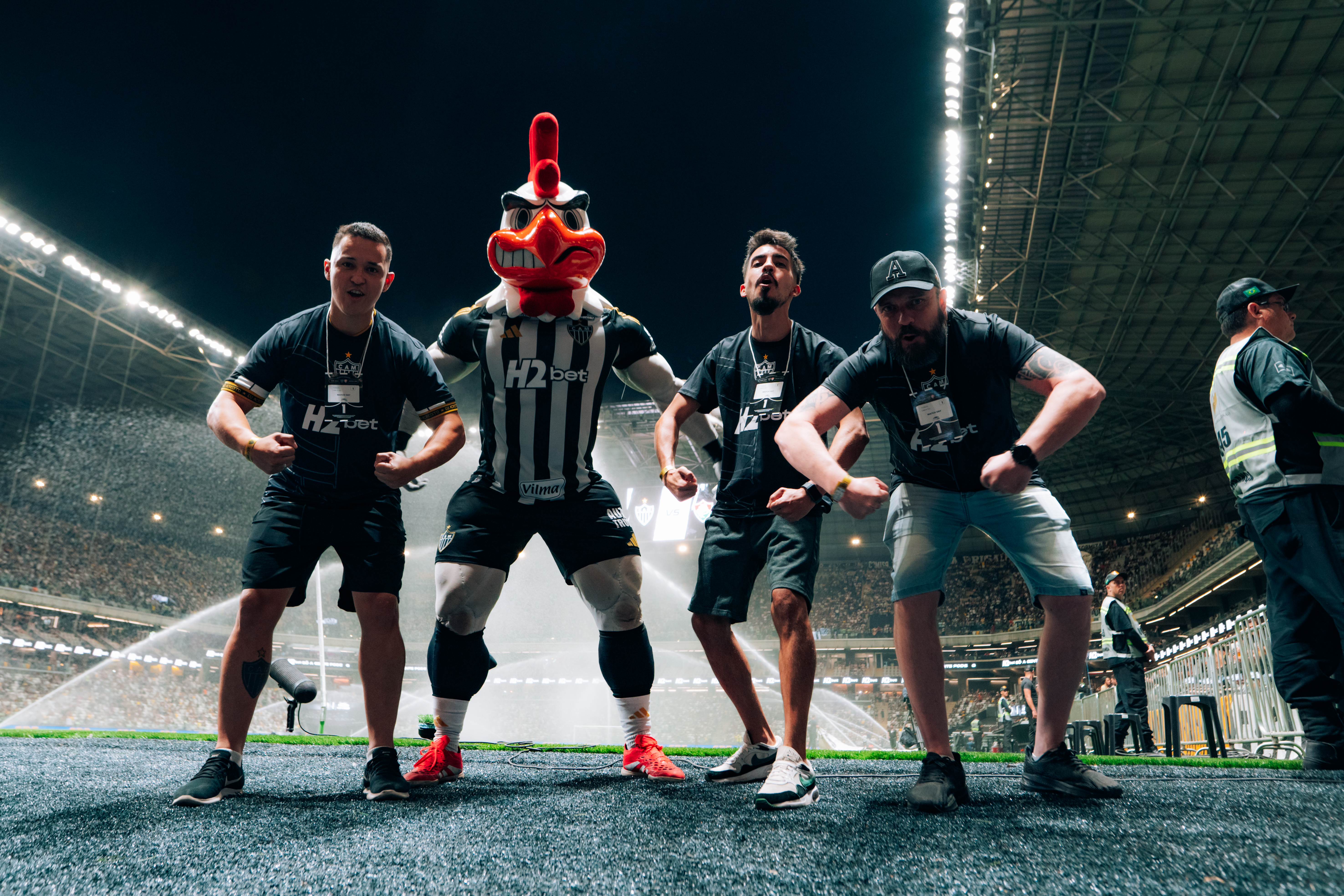 Em mais uma ativação que gerou impacto visual e engajamento, o Galo Doido, mascote oficial do clube, utilizou uma bazuca de brindes para disparar mais de 40 itens promocionais – e sacochilas do H2bet – diretamente para o público.