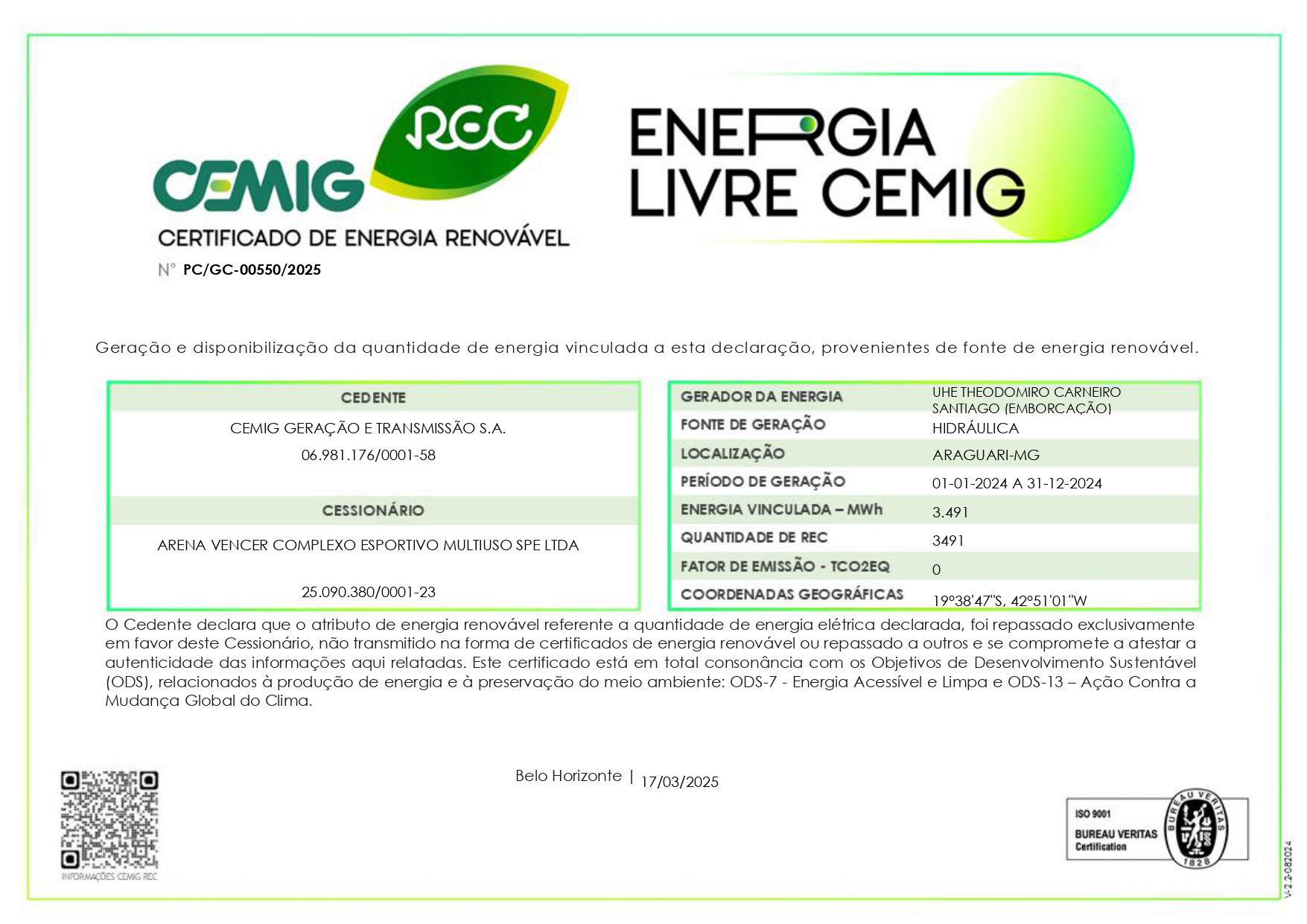 Dessa forma, a alternativa mais viável e sustentável foi o mercado livre, onde conseguimos ao lado da CMU uma fonte renovável de energia. Abaixo apresentamos o certificado que comprova que o fornecimento de energia da Arena MRV é renovável.