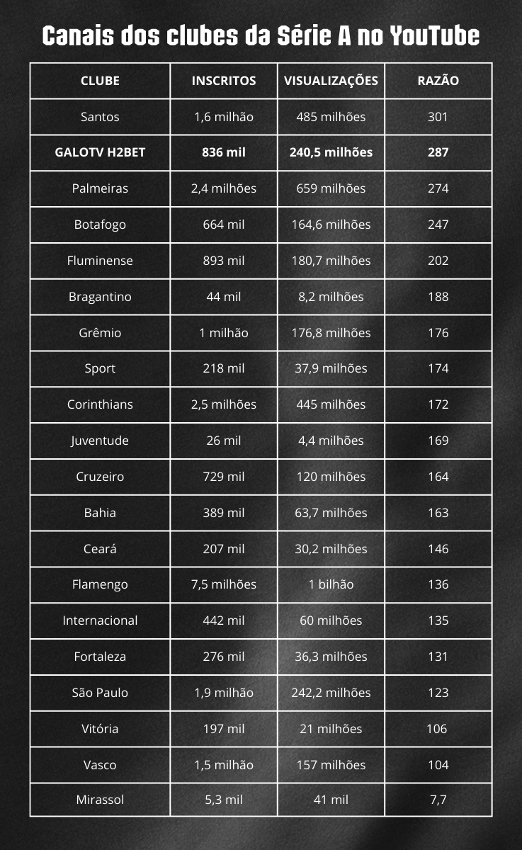 A divisão entre visualizações totais e inscritos do canal ajuda a entender melhor a audiência dos canais de TV. No caso da Galotv, é como se cada inscrito do canal representasse 287 visualizações. No caso da Santos TV, seriam 301 visualizações por inscrito. Tirando o canal oficial do clube paulista, todos os outros 18 times da Série A do Brasileiro estão abaixo do Atlético.