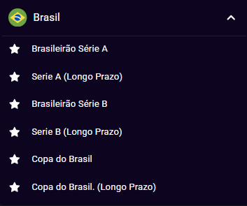 Então, por exemplo, se você estiver procurando por alguma aposta do futebol nacional, você precisa clicar em “Futebol”, depois em “Brasil”. Pronto! Agora é só procurar as competições que estão marcados com a descrição de “Longo Prazo”, que é a tradução não literal de “outrights”.