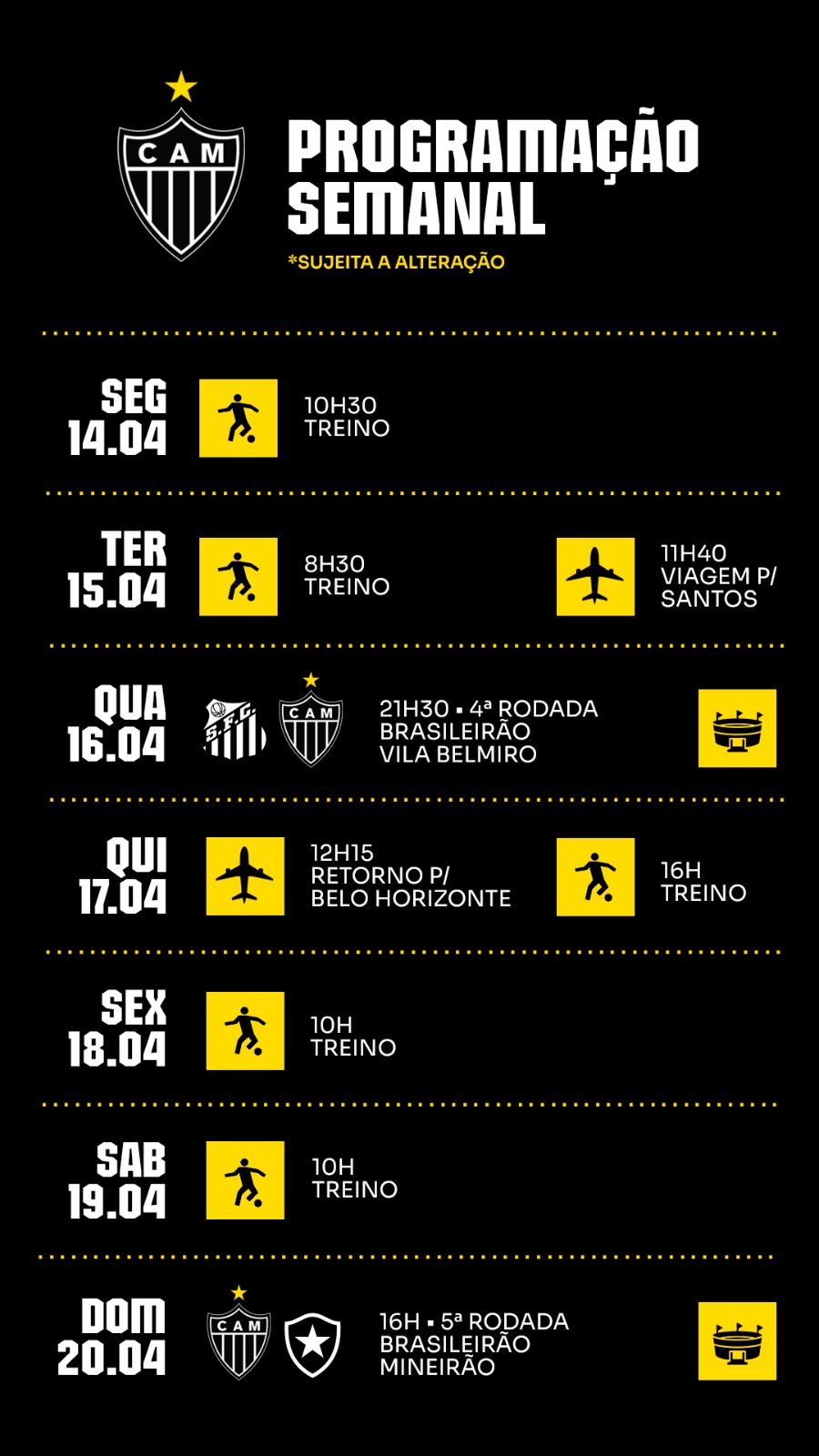 Confira a programação de treinos e jogos do Galo: