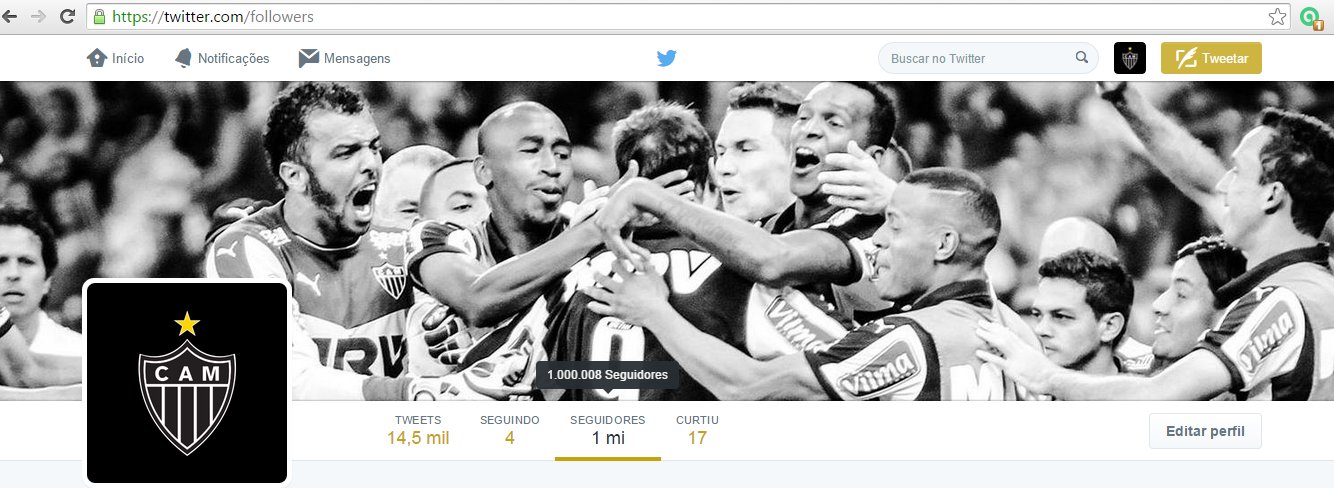 O Atlético foi o primeiro clube de Minas Gerais a atingir a expressiva marca de um milhão de seguidores em seu perfil oficial no Twitter.